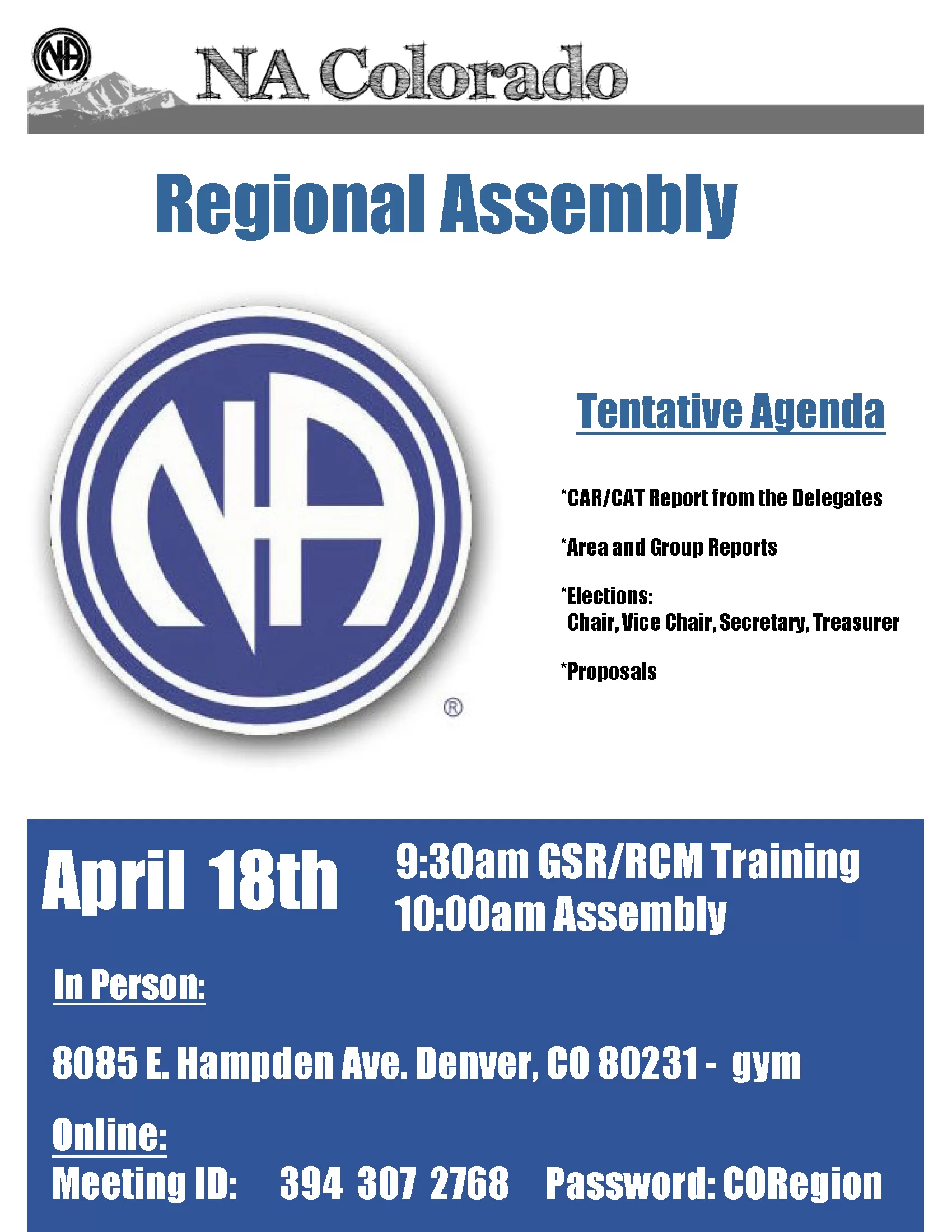 The motion tally sheet was due by April 17th and the outcome will be presented at the Regional Assembly on April 18th, 2026 which is at 8085 E. Hampden in Denver.